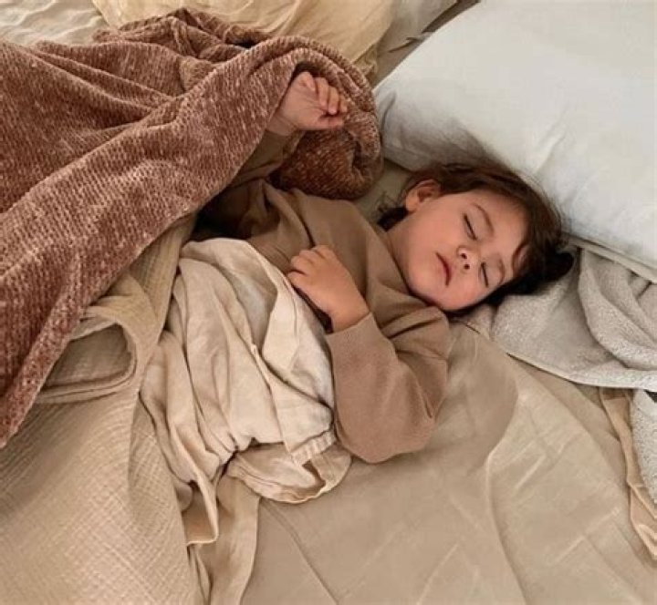 In the picture, the young boy is seen dozing off while cuddling up to his mother and is dressed entirely in a gray knit outfit and beanie.